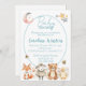 Convite de chá de bebê de vida selvagem na floresta apresenta um lindo design em aquarela com uma raposa, uma ovelha, um urso e um patinho. Eles estão reunidos em um jardim de flores silvestres e dois doces abelhões estão coletando néctar. A lua e algumas estrelas estão no céu. Personalize o convite com todas as suas informações usando o modelo fácil de usar fornecido. Certifique-se de atualizar o verso com onde a futura mamãe está registrada! Versões adicionais também estão disponíveis na coleção.