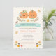 Bonita e engraçada Ação de graças aos casais convidados chás com um par de abóboras adoráveis de mãos dadas. A noiva a ser veste um arco verde de folha de bolinhas e segura um buquê de margaridas em uma mão enquanto seu belo noivo veste uma taça de folha de bolinhas correspondente e mantém as mãos com ela. Awww.... Bolotas, cogumelo, louro-marrom e folhas amarelas e laranja e um banner aqua complementar com corações tornam esse design perfeito para um chá de casamento de outono. "Graças Um Ao Outro" Trabalho de arte © Chrissy H. Studios, LLC. Todos os direitos reservados.