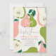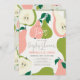 Este cartão de convite para casais/chás de panela/festas de noivado, bonito e moderno, "está a caminho" apresenta peras cor-de-rosa e verdes e fatias de pera num fundo creme enquadrado por uma borda verde-clara. O verso apresenta um fundo verde claro com padrões de pera. Personalize-o para as suas necessidades. Você pode encontrar produtos correspondentes na minha loja.