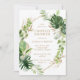 Casais botânicos modernos convidam chás de casamento com uma estrutura geométrica cercada por verde tropical pintado com aquarela e folhas de ouro falsas. Seus detalhes e o fundo estão em um tom dourado correspondente. Este convite elegante é perfeito para uma celebração de verão.