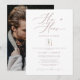 Este convite de chá de panela de casal em dourado rosado com foto e caligrafia moderna e ousada é perfeito para um chá de panela de casamento moderno ou minimalista. O design apresenta uma tipografia elegante, mas rústica, com uma das suas fotos no verso.