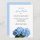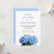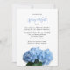 Chá de casamento para o casal. Flores de hydrangea azuis design em papel branco com texto impresso a preto. Personalize facilmente o texto em três lugares com nomes da noiva e do noivo em um script azul claro. Incluir "hospedado por" e informações de registro, conforme necessário. Adicione ou remova espaços para tornar o seu ajustado de texto o espaço. O reverso é azul-claro sólido. Flores realísticas, azuis, de hydrangea, decoram o fundo das cartas com imagens verdes. Este modelo de convite é parte da linha de design "Céu Azul".