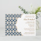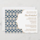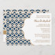 O elegante e belo francês marroquino inspirou convites para chás de casamento de casal com uma matiz de safira azul de marinho repetitiva e um padrão geométrico de design e flores de ouro abarrotadas. Este convite de aparência altíssima e luxuosa é perfeito para qualquer chá de noivado formal, exótico, marroquino, árabe ou aladino de casais temáticos. A parte de trás desses convites e anúncios personalizados de quadro de rico pode ser personalizada com os nomes de noiva e noiva logo atrás do convite. Trabalho de arte e design © Chrissy H. Estúdios, LLC. Todos os direitos reservados.