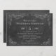 Este convite formal para chás de casamento com um design de estilo de etiqueta de vinho vintage. O giz de mão russa que olha esboços de folhas de videira enquadram os detalhes importantes. Um simples design florescido com a data do evento aparece no lado oposto. Branco suave / cinzas em um fundo no estilo de quadro negro com aparência texturizada.