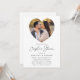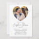 Convite simples para o chá com a foto do seu noivado aninhada dentro de um quadro em forma de coração sobre um fundo branco. Personalize o chá de fotos com seus nomes e detalhes do chá mostrados abaixo em letras pretas com "Chá" exibido em um script manuscrito.