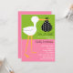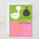 Um convite de chá de fraldas com uma ilustração de um carregando de cegonha um pacote preto com bolinhas brancas. O fundo é verde na metade superior e rosa na metade inferior. Personalize o texto com detalhes da sua ocasião.