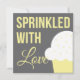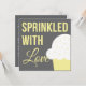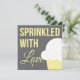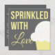 Um convite para chás de fraldas engraçadinho, com um cupcake com aspersas e o texto "borrifado com amor"