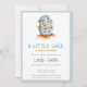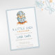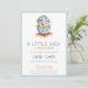 Convite de chá de fraldas azul com um pintinho a eclodir do seu ovo. A paleta de cores é azul, amarela e laranja. A ilustração representa uma eclosão de um bebê pintinho e o texto diz " Um pequeno pintinho está prestes a eclodir". Todo o texto é personalizável. Se quiser adicionar apenas as suas informações pessoais, pode preenchê-las facilmente em cada linha. Se quiser personalizar mais, clique em personalizar mais e para que você possa alterar fontes, tamanhos e cores. Ilustrada e projetada por Patricia Alvarez.