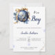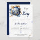 Bem-vindos a uma elegância clássica neste Natal com nossa coleção de Chás de fraldas Modernos Minimalistas. Apresentando o título "É um menino" com uma bela fonte desenhando o olho como a característica próxima ao pop solteiro de cor azul pastel no bauble em forma de lágrima de Natal. A escuridão do branco e do preto com atenção a fontes detalhadas e a tipografia é perfeita para os Chás de fraldas de inverno. O nosso Convite para Chá de fraldas do Ornamento Azul de Natal é uma forma clássica e elegante de convidar os seus convidados a celebrar a alegria de Natal com a chegada iminente de um novo bebê.