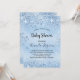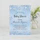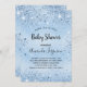 Para um chá de fraldas, comemorando um menino. Um fundo metálico azul-claro e falsa. Decorado com pó de brilho falso. Modelos para o nome da mãe e detalhes da festa. O nome e o texto: Chá de fraldas são escritos com um script de estilo manuscrito