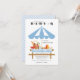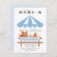 Convite de chá de fraldas de churrasco exclusivo com mesa de piquenique com um guarda-chuva azul e branco com um gingham azul de volta para um chá de fraldas para rapazes. Visite nosso compro para ver este design em rosa, vermelho e verde para meninas e chás neutros.