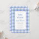 Este convite para chás de fraldas apresenta um fundo azul e branco de gingham azul rústico. O texto aparece num retângulo branco com uma fina borda azul e cantos arredondados, com as palavras "chá de fraldas" e o nome da futura mãe na charmosa tipografia azul e o texto restante na fonte sans serif da cinza. Ideal para o chá de fraldas de um menino. O padrão de gingham é repetido na parte de trás do cartão.