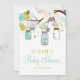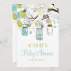 Convide familiares e amigos para o seu evento com este convite de chá de fraldas personalizável. Apresenta ilustrações de potes, corações, corações e variedades de flores de mason azul e verde. É um convite perfeito para uma festa de primavera ou chá de fraldas de verão.