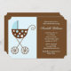 Simples convite para chás de fraldas ou novo anúncio de nascimento ou adoção de bebê apresenta uma bela ilustração vetorial de uma carruagem de bebê ou carrinho em tons de azul e marrom. Cores personalizadas disponíveis por solicitação.