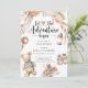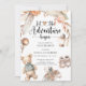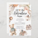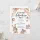 Um belo convite para o chá de fraldas, que inclui uma mistura de artigos para bebês, de ursos de pelúcia a roupa de cama, frascos para bebês e calçados para bebês com flores e penas, em pêssego creme e matizes castanhos.