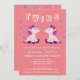 Um Belo Unicórnio Gira 2 Bebês, Chá de fraldas Convite. O design tem dois unicórnios fofinhos, cor-de-rosa, para gêmeos. O fundo é rosa com pontos cor-de-rosa.