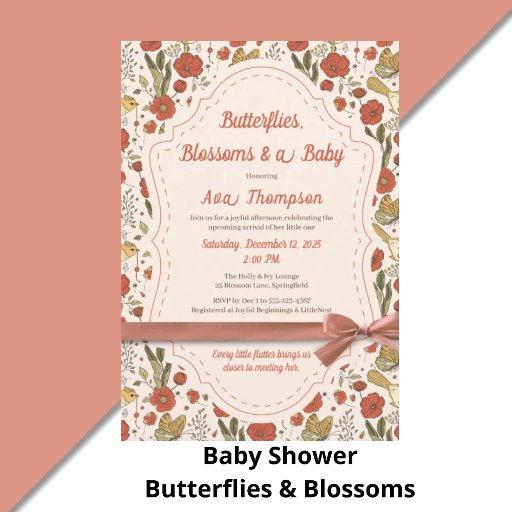 Design elegante e poético de chá de fraldas com borboletas delicadas e flores macios. Perfeito para uma celebração chic e minimalista honrando as mamães a serem. As cores pastéis suaves e os motivos florais tornam-no ideal para acolher um novo bebê com amor e estilo.