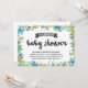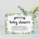 Este convite para chás de fraldas bonito apresenta uma bela borda azul e verde da coroa floral, bonito caligrafia com script de pincel e um banner rústico de chic chalkboard.