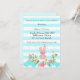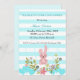 Convite para chá de fraldas azul creme, design com coelho, flores, linhas brancas e azuis e balões.