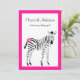 Um belo convite de chá de fraldas rosa-quente e zebra negra para uma menina. Personalize esse chá de fraldas de zoológico com uma zebra cinzenta com um arco rosa bonito e cascos rosas embaçados acrescentando o nome da mãe para ser e informação de festas. ©Party