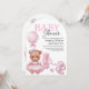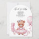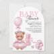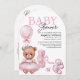 Convite para chá de fraldas com uma ilustração adorável de aquarela de um ursinho de pelúcia num vestido rosa fofo.
