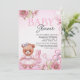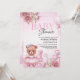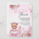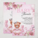 Convite para chá de fraldas com uma ilustração adorável de aquarela de um ursinho de pelúcia num vestido rosa fofo.
