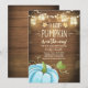 Europeia: Um chá de fraldas bonito e divertido, convidando para um pequeno abóbora no caminho! Fundo de madeira russa com luzes de cordas e uma abóbora azul para um chá de fraldas de menino.