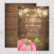 Europeia: Um chá de fraldas bonito e divertido, convidando para um pequeno abóbora no caminho! Fundo de madeira russa com luzes de cordas e uma abóbora rosa para um chá de fraldas de Garota.