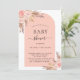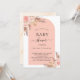 Para um chá de fraldas moderno. Um quadro de arco, fundo branco e rosa dourado. Decorados com ouro rosa e flores, rosas e erva-pampas cor-de-rosa. Personalize e adicione um nome e detalhes. Traseira: impressão de mármore rosa de ouro leve.