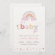 Estes adoráveis convites para o chá de bebê apresentam estilo de vassoura de tendências e roteiro manuscrito de tendências. Um arco-íris trágico e neutro pintado é decorado com flores de cor de laranja e pêssego em um simples fundo branco.