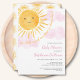 Você está planejando um chá de fraldas temático? O chá de fraldas de uma garota giro apresenta o texto "Nosso raio de sol está quase aqui!" com uma aquarela sorrindo sol amarelo e nuvens cor-de-rosa. As costas estão decoradas com um padrão solar. Facilmente personalizável. Original Watercolor © Michele Davies.