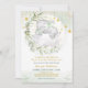 Convite temático de cinzas reluzentes com uma estrela elegante, verde-aquarela, um bebê elefante giro, lua sonhenta e elementos estelares