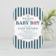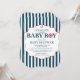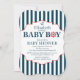 Chá de fraldas náutico bonito para seu chá bebê. Nosso convite para chá de fraldas náutico de menino moderno apresenta um fundo de faixa azul e branca com uma âncora e roda de naves. Sacudir nosso bebê chic e na moda para se convidar para encontrar uma resposta para um toque especial. Perfeito para um chá de fraldas de temas náuticos, para embarcações de vela, barcos, barcos, Verão ou praia