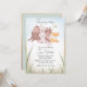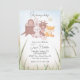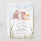 Este chá de fraldas bonito apresenta um tema doce e ilustrado de animais florestais. Uma imagem de desenho animado de pequenos bichos-da-mata-bebês é apresentada no centro. Um ouriço, cervo, coelho, raposa e pássaro são reunidos em torno de um toco de árvore na floresta. Uma borboleta fofa está fluindo sobre eles. O fundo apresenta um céu azul e grama ao longo da parte inferior. É perfeito para um Primavera ou chá de fraldas de Verão.