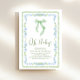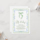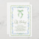 Encantador e bonito convite para chás de fraldas, sem distinção de gênero, com quadros verdes e azuis de cor azul inspirados em vintage, uma aquarela de arco verde, "Oh Baby", mostrada em um roteiro chic, e o nome da futura mãe e os detalhes do chá na tipografia serif clássica.