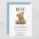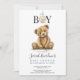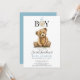 Um convite para chá de fraldas rústico giro com um ursinho de pelúcia, com uma vibração moderna rústica, e a frase "oh boy"! Tipografia azul e preta e azul no verso do convite.