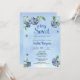 Celebre o doce bebê a caminho com este convite para chá de fraldas de mirtilo. Amoras azuis em relevo e folhas com efeito de aquarela impressão contra fundo azul de lavagem de aquarelas. Use em um chá de fraldas de mirtilo ou evento de aspersão de bebê; especialmente para um menino, ou edite para usar para um convite de aniversário de amora doce. Disponível com produtos correspondentes.