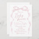 Os convites para bebês elegantes apresentam um arco de fita desenhado manualmente com fontes modernas de script manuscritas em rosa pincelado e suave. doce e simples. Excelente para chá de fraldas caprichoso único. Veja todas as peças correspondentes na coleção.