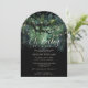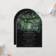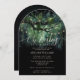 Uma ilustração com uma aquarela esbranquiçada de um arco foliar rico, esmagado, verde e cortado com detalhes florais em verde esmeralda, brilhante com luzes de fadas e poeira mágica, decora este primavera de verão outono este convite de chá de fraldas de inverno com um tema florestal encantado. Um convite elegante e moderno para um chá de fraldas de conto de fadas. Perfeito para novas mães e famílias que amam o cenário florestal de conto de fadas, o tema da floresta de fadas ou do jardim de fadas e esmeralda verde, mauve e ouro.