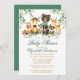 Watercolor Woodland Animal Chá de fraldas Invitation. Os Bebês incluem Urso com arco verde, Veado, Moose, Raccoon, Coelho Coelho, Raposa e Coruja em folhas de eucalipto e verde florestal. Texto verde e Dourado.
