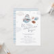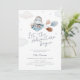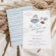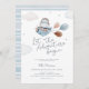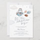 Celebrar a mãe a ser com este convite de chá de fraldas de temas azuis e bronzeados com viagens vintage, com ilustração aquática de um hipopótamo fofo num avião com balões, nuvens e estrelas e um reverso listrado azul.