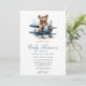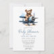 Prepare-se para celebrar com este adorável convite de chá de fraldas de avião para ursos de pelúcia. Apresentando um ursinho de pelúcia a aquarela vestido como um pequeno aviador num avião azul-vintage, este convite é perfeito para o chá de fraldas de um menino com um tema aventureiro. As cores suaves e o design encantador fazem dela uma escolha encantadora para os pais esperando um menino que esteja pronto para voar.