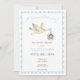 Bem-vindos a um pequeno com encanto de feitiço e zangão. Nosso convite de chá de fraldas encantador apresenta o carregando de cegonha-d'água, seu pacote de precioso, com o título "entrega especial". Um bebê dormindo boia em uma fita azul cercada por duas pombas destaca o dorso. Azulejos suaves, cremes e cinzentos criam uma sensação quente de um livro de histórias sobre um fundo branco nítido. Perfeito por comemorar com um toque de capricho e maravilha! Criado pela imprensa simplesmente de farmácia.