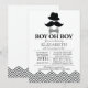 Perfeito para um chá de fraldas temático "Oh Boy", "Little Man" ou "Mustache"! Nosso convite para bigode bonito e moderno apresenta um chapéu de topo, bigode e gravata de arco em um fundo branco nítido com uma borda de fêmur preta. Sacudir o convite para ver uma correspondência de volta para um toque extra especial.