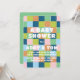 Celebre o bebê e os pais a estarem com este convite de chá de fraldas. Um padrão de fundo de quadrados coloridos de tabuleiro de xadrez numa combinação neutra em termos de gênero de rosa, laranja, verdes e blues impede que esta celebração de bebês seja estereotipada e reflita a mãe moderna e uma estética de atraso.