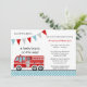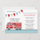 Um convite de chá de fraldas de um caminhão de bombeiros, com um pingente de banner e bolinhas.