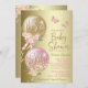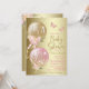 Convite de chá de fraldas rosa e ouro com balões bonito cor-de-rosa e dourados com flores, borboletas e arcos sobre um belo fundo dourado. Este convite para chás de fraldas cor-de-rosa giro e dourado é facilmente personalizado com os detalhes do seu evento.