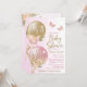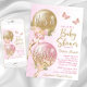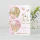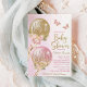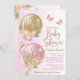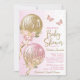Convite de chá de fraldas rosa e dourado com balões bonito cor-de-rosa e dourados com flores, borboletas e arcos em fundo rosa e branco. Este convite para chás de fraldas cor-de-rosa giro e dourado é facilmente personalizado com os detalhes do seu evento.