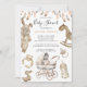 Um belo convite para chás de fraldas, neutro em termos de gênero, que inclui uma coleção de artigos para bebês, brinquedos para bebês, roupas e carrinhos de bebê. Matizes terríveis, castanho e cor-de-rosa.