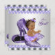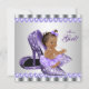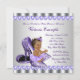 Chá de fraldas roxo e cinza convidada com uma adorável menina indígena hispânica afro-americana vestindo tutu roxo e arco com cordas de pérolas sentadas sobre um par de calçados roxos de alto salto roxo em uma cinza prateada e fundo de pérolas roxas. Este convite de chá de fraldas roxo e cinza é facilmente personalizado para o seu evento adicionando os seus detalhes na fonte e na redação da sua escolha. Este é um design impresso sem brilho real, pérolas, arcos etc.